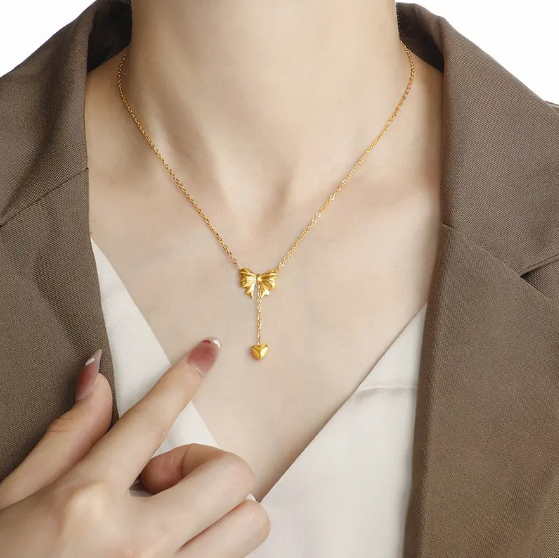 A delicate blend of charm and elegance, this necklace features a dainty bow knot with a heart drop pendant — symbolizing love and femininity. Crafted from 316L Titanium Stainless Steel with 18K gold PVD plating, it’s anti-tarnish, waterproof, and long-lasting, making it perfect for daily wear or gifting.