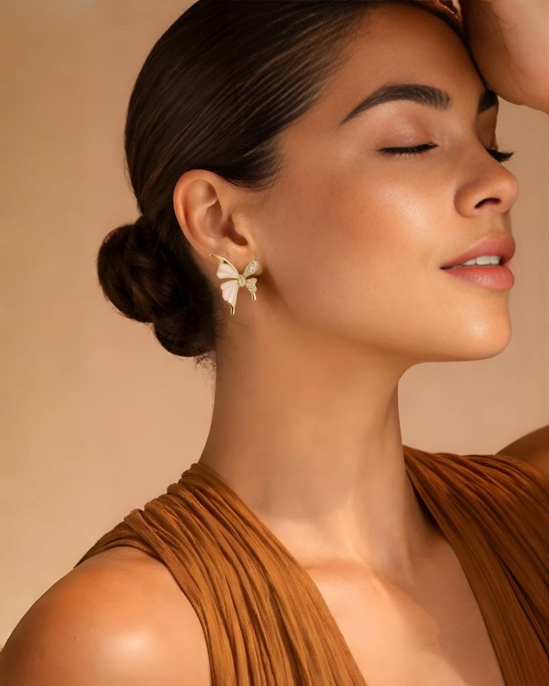Graceful and feminine, these gold-tone butterfly stud earrings feature soft white enamel wings accented with delicate sparkle stones. Designed to feel light and elegant, the butterfly motif adds a subtle statement while maintaining an effortless everyday charm. Finished with a smooth polish and comfortable stud backing, these earrings are perfect for daily wear as well as special moments.